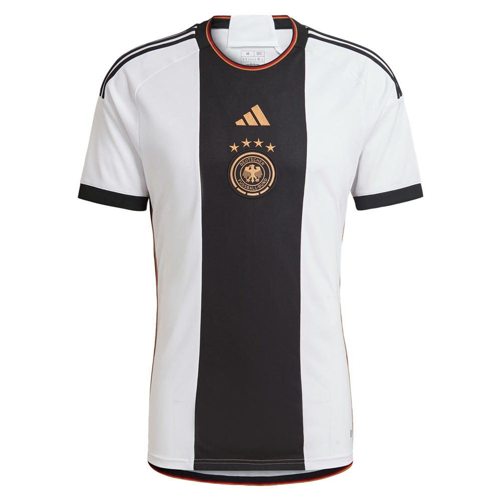 ドイツ代表の22/23シーズンユニフォームは、スピードを重視したデザイン。グナブリ、ゴーゼンズ、サネ、ヴェルナーがこのユニフォームで戦う姿が目に浮かびます。レーシングストライプからインスパイアされたデザインには、ロイヤルゴールドのアクセントと中央に配置されたロゴが特徴です。内側の襟部分には「die mannschaft」のサインと、上に4つの星がプリントされています。外観は洗練されており、ドイツ代表がこれまでで最も格好良く見える瞬間を演出しています。