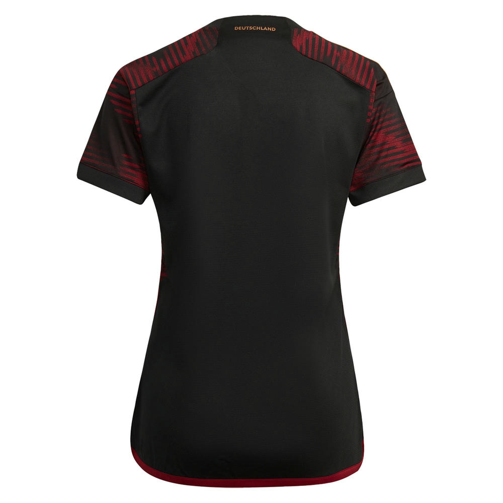 2022/23年ドイツ女子代表アウェイユニフォームは、ゲームの速さと興奮をグラフィックデザインで表現しています。金色の動的な線が互いに絡み合い、アルファベットの「D」を再現しています(もちろん「Deutschland」のためです)。強いブラックとゴールドのカラーパレットは、国旗への敬意を表し、内襟には「die mannschaft」と4つの星がプリントされています。これもまた記憶に残るドイツ代表のユニフォームです。