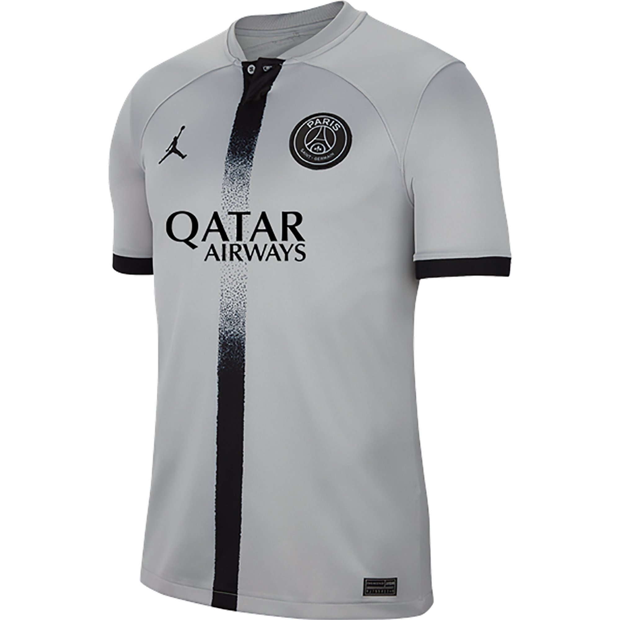 PSGの2022/23アウェイユニフォームはジョーダンブランドとのコラボで、パルク・デ・プランスの雰囲気を表現したブラックとスモーキーグレーのデザインです。ファンの記憶やスタジアムの光と影が反映され、どこでも“ホーム”を感じられます。
