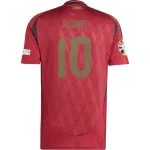 2024年ベルギーのホームジャージは、鮮やかな赤を新しいダークな色合いに置き換え、上品で気品のあるルックを作り出しています。
