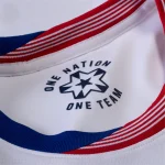 24/25 USAホームユニフォームは、赤・白・青のリブデザインでアメリカの愛国心を表現。白を基調に、ナイキのDriFit Advanceがレーザーカットと通気機能を強調。襟内側には星と「One Nation, One Team」のメッセージが刻まれています。