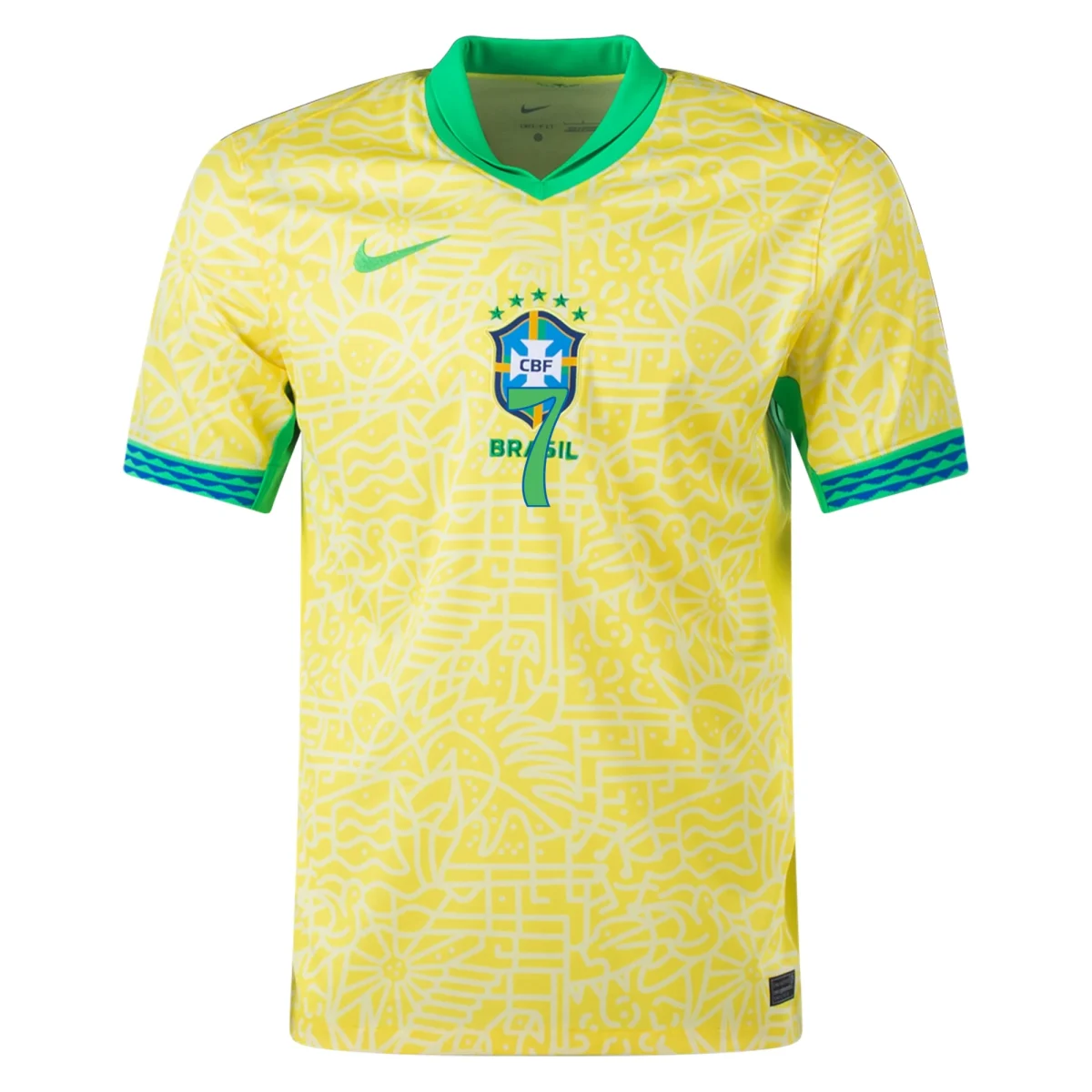 ブラジル24/25ホームキットは、自然遺産を祝う精巧なパターンが特徴で、音符やマコウ、シュガーローフ山からビーチまで、ユニークなブラジルのディテールが映えています。CBFエンブレムは2004年のユニフォームと同じ位置に配置されています。
